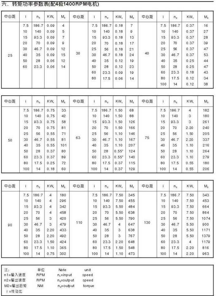 转矩功率参数表(配4级1400RPM电机)