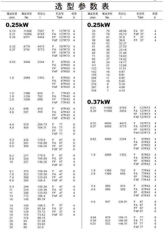 选型参数表0.25kW和0.37kW