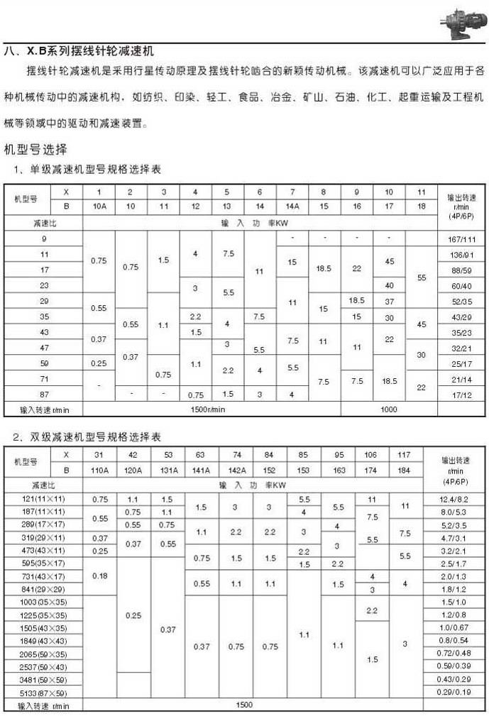 X . B摆线针轮减速机说明单级减速机型号规格选择表双级减速机型号规格选择表