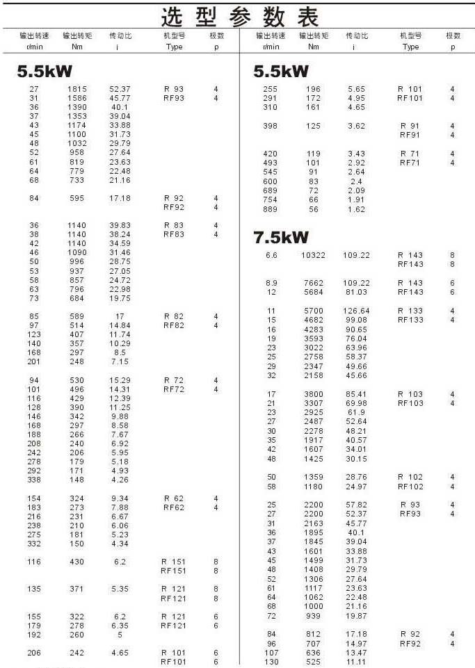 选型参数表5.5kW(续)和7.5kW