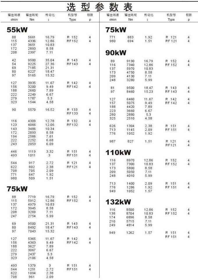 选型参数表55kW,75kW,90kW,110kW,132kW